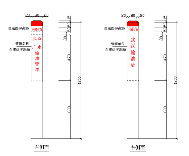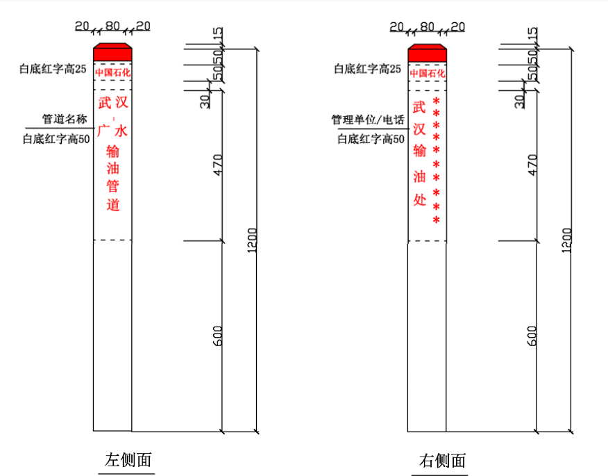 ⑴ 加密樁/通信標(biāo)識(shí)均標(biāo)注中國(guó)石化名稱、管道名稱、警示用語(yǔ)、管理單位和聯(lián)系電話。